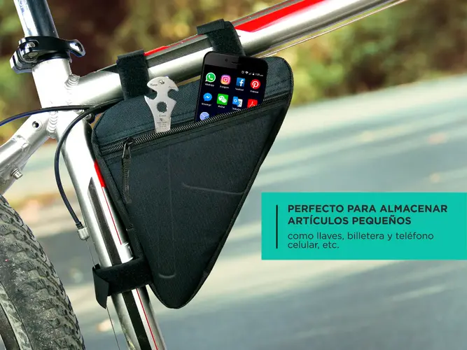 El bolso triangular para bicicleta se puede instalar en la mayoría de bicicletas de carretera y bicicletas de montaña. Perfecto para almacenar artículos pequeños como llaves, billetera y teléfono celular, etc.