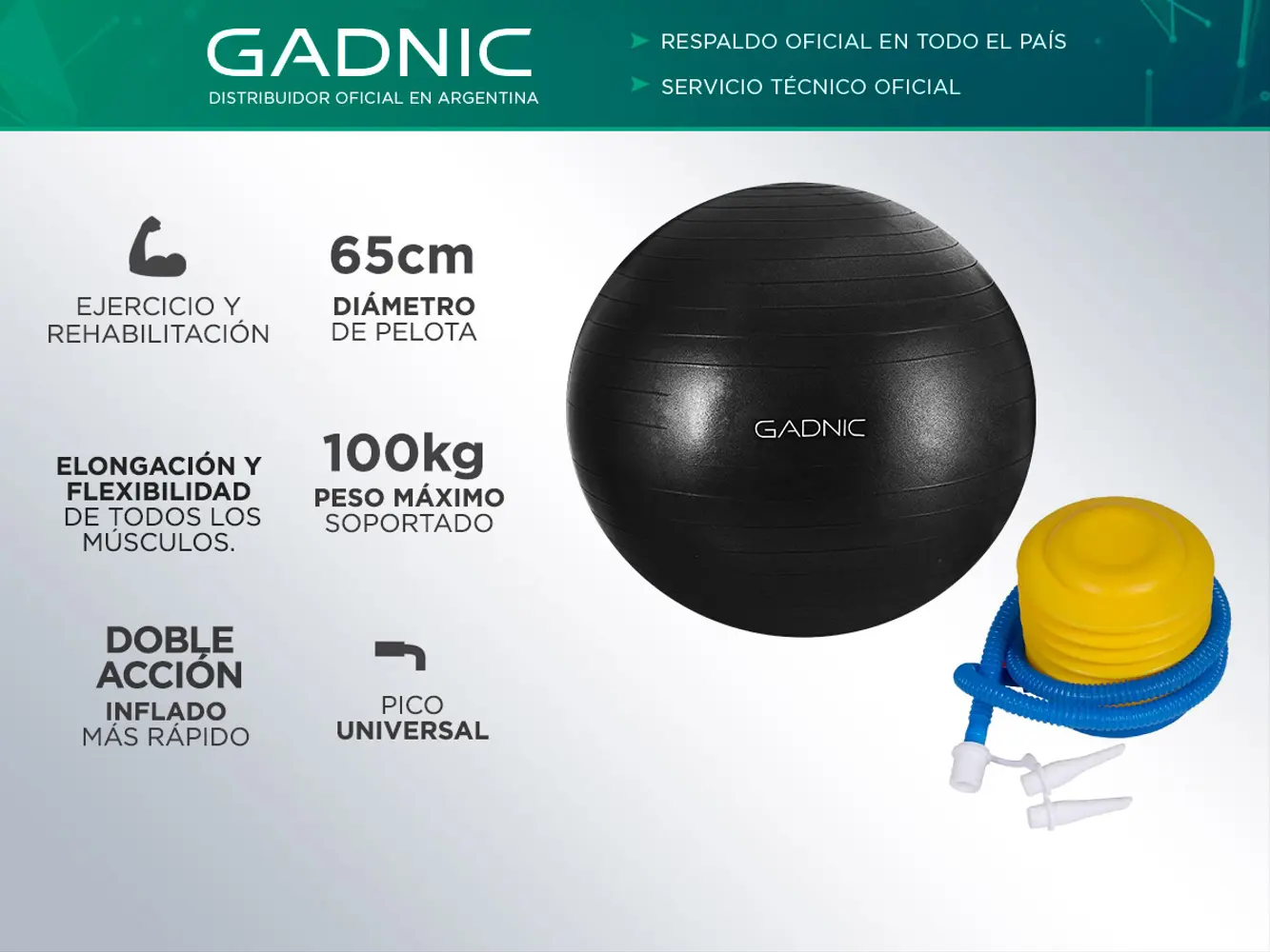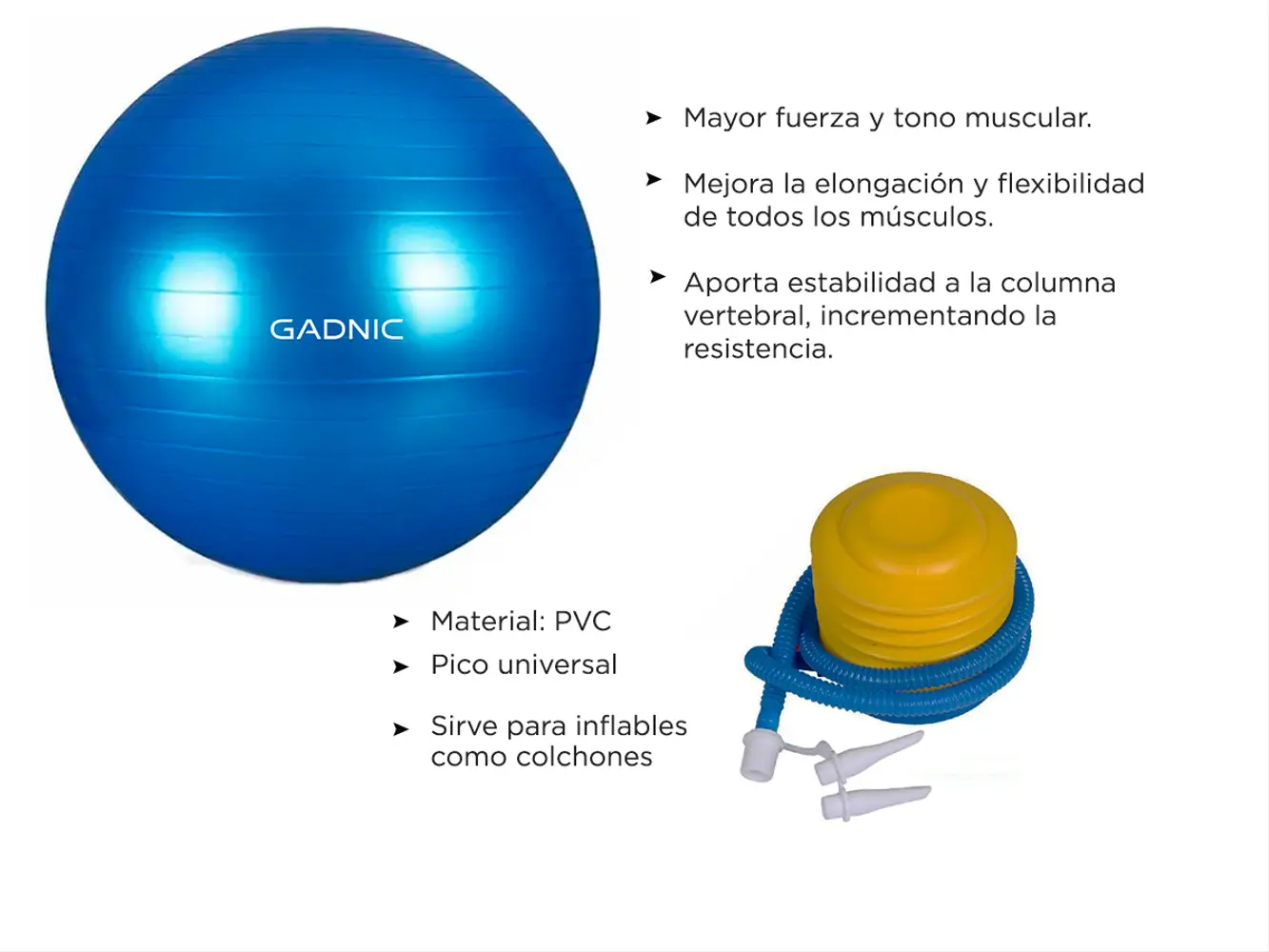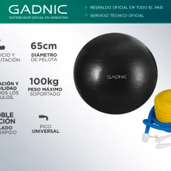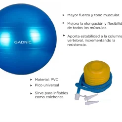 La pelota de pilates Gadnic , ofrece una variedad de actividades específicas que auxilian en el mantenimiento de la forma física, así como en el estiramiento y rehabilitación corporal. Muy utilizada en clases de pilates y yoga, la misma sirve para diversos tipos de actividad como ejercicios de equilibrio y abdominales. Con la capacidad de soportar hasta 200Kg de impacto, la Bola de Pilates Gadnic posee una pared de PVC gruesa para uso pesado con tecnología anti-desbordamiento, buscando la seguridad del usuario.
