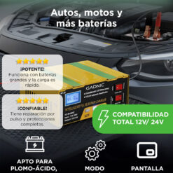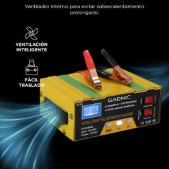 El Cargador Inteligente Gadnic está diseñado para mantener en óptimas condiciones las baterías de autos, motos y otros vehículos. Compatible con baterías GEL, ácido plomo y litio (12 V y 24 V), detecta automáticamente el tipo de batería y ajusta la corriente para una carga rápida y segura. Ideal tanto para uso doméstico como profesional.