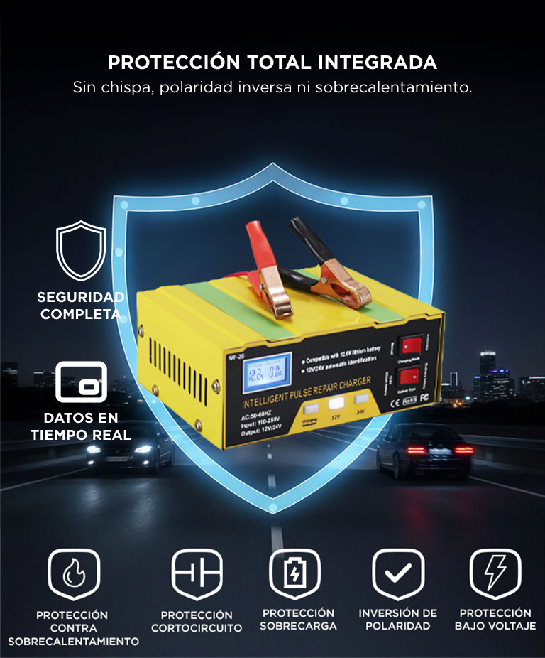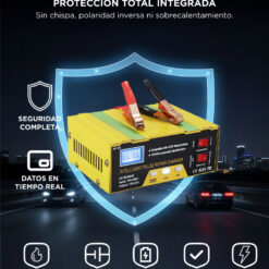 Incorpora un sistema de protección completo contra polaridad inversa, sobrecarga, cortocircuitos y sobrecalentamiento. Su carcasa de alta resistencia y ventilación activa aseguran un funcionamiento estable y duradero, incluso en uso prolongado.
