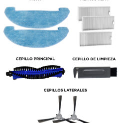 Incluye cepillo principal, cepillos laterales, mop, filtros HEPA y cepillo de limpieza. Simplifica el mantenimiento sin necesidad de comprar accesorios por separado.