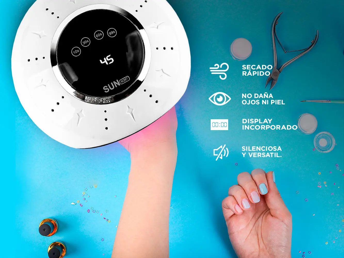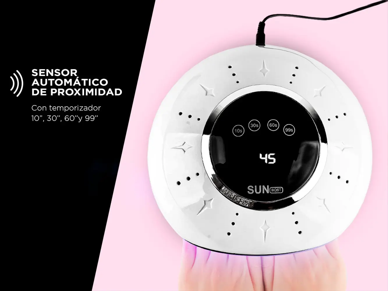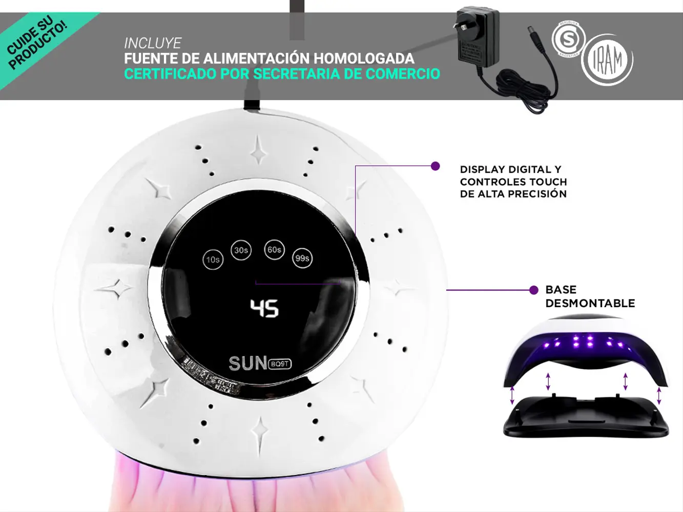 Esta Lámpara de uñas GADNIC de alta potencia cuenta con modo inteligente y tecnología LED avanzada, función de temporización de múltiples posiciones (con 4 configuraciones de temporizador, 10S, 30S, 60S, 99S) y base imantada removible.
