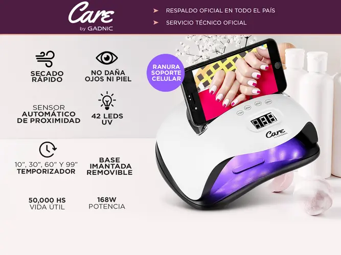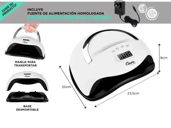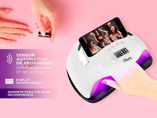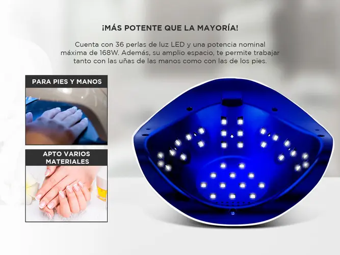 Con 36 perlas de luz y una potencia nominal máxima de 168 W, nuestra lámpara de uñas de gel LED UV es más potente que la mayoría. La pantalla digital LED incorporada muestra el tiempo de secado de las uñas. Y debido a la protección contra la temperatura, no te quemará las manos durante el curado