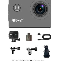 La Camara 4K WiFi es una cámara deportiva compacta y potente que graba videos en 4K y fotografía hasta 16 MP. Gracias a su lente gran angular de 170 grados y pantalla LCD de 2 pulgadas, podés capturar cada momento con nitidez y controlar todo en tiempo real.