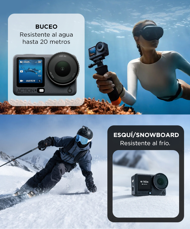 Sumergible hasta 20 m sin estuche [4]. Graba vlogs, practica surf o nada con esta cámara sumergible y captura cada salpicadura en impresionantes vídeos 4K.