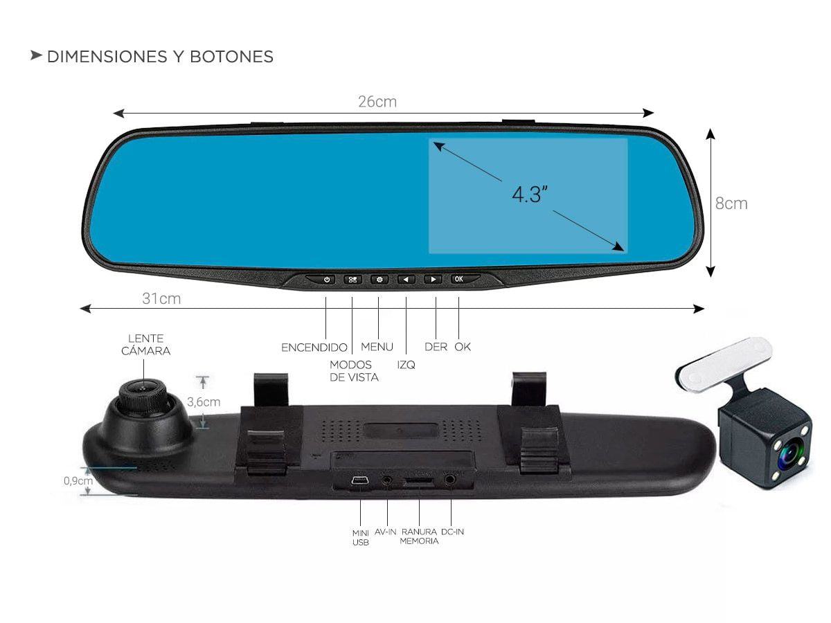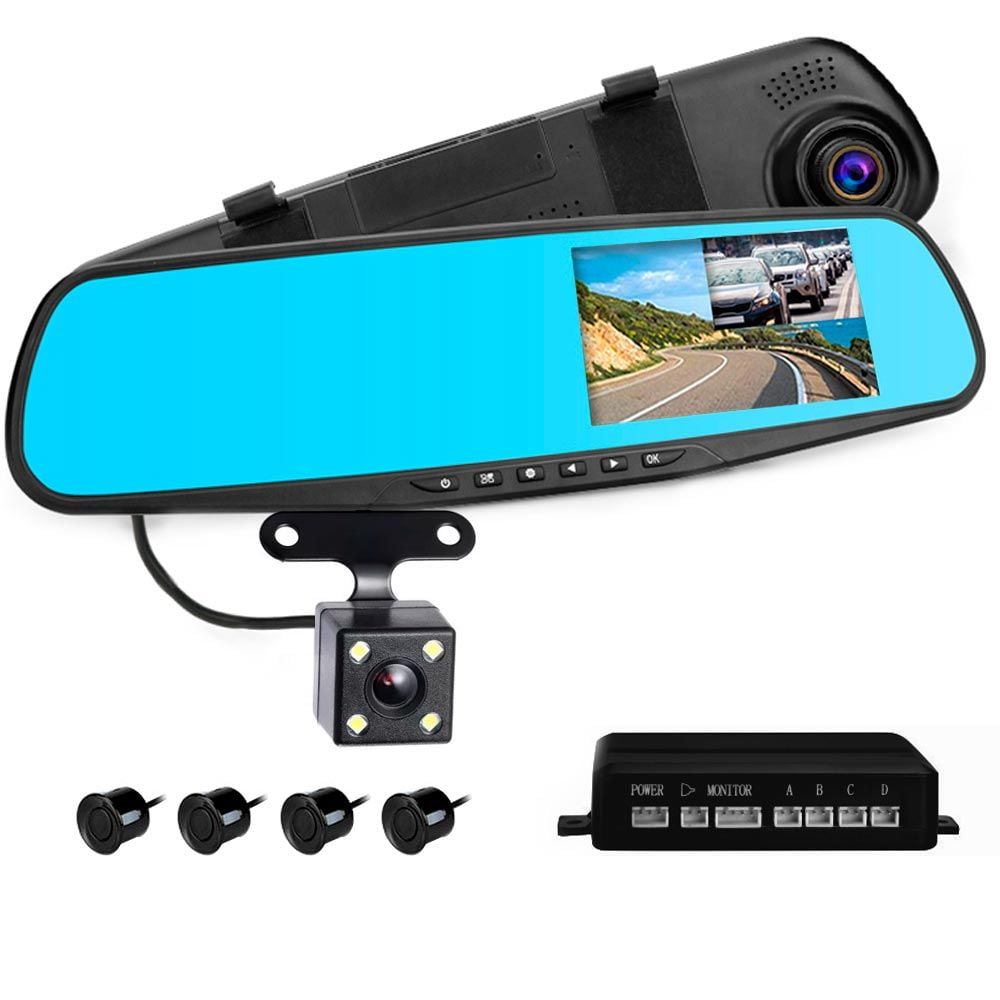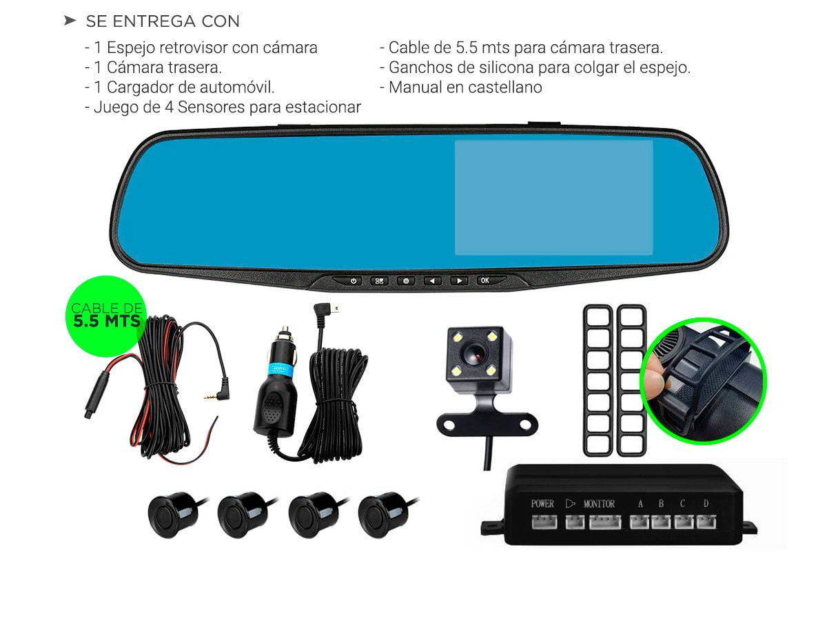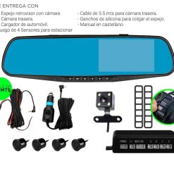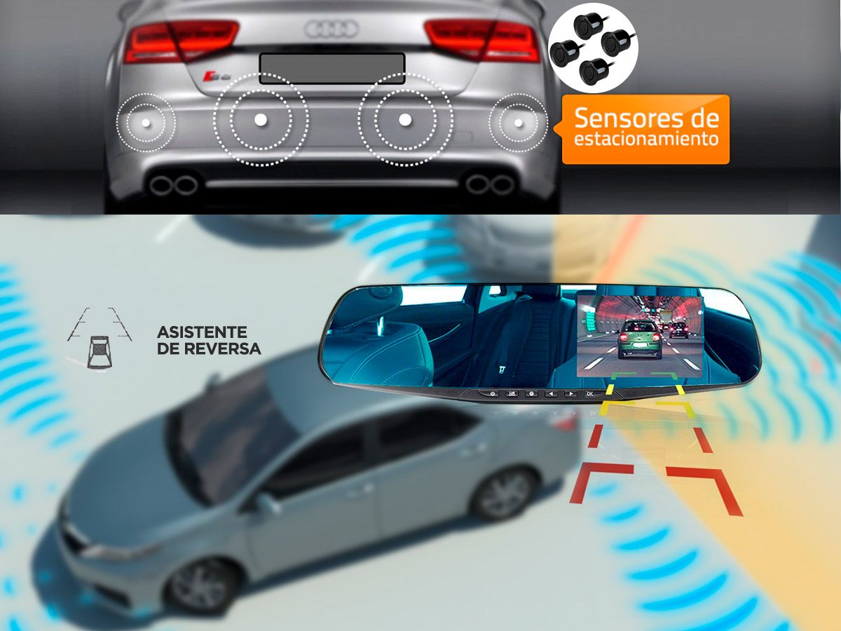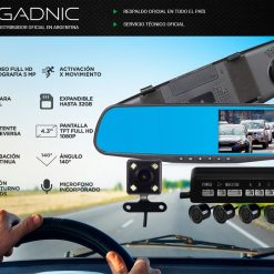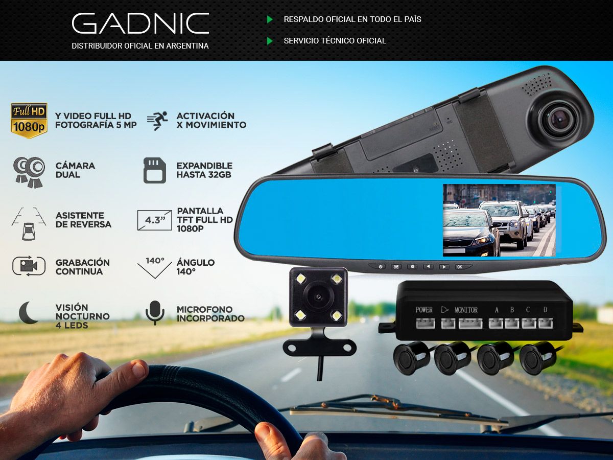 El Kit Espejo retrovisor Gadnic con pantalla táctil de 4,3 pulgadas, equipada con un lente de 140 grados de angulo amplio ademas de visión nocturna, resolución de foto y vídeo FULL HD 1080P, incluye cámara de reversa que incorpora asistente de estacionamiento. Permite grabar todo lo que sucede mientras manejás el vehículo, en caso de accidente o cualquier hecho que ocurra, la cámara lo capta todo. Ademas incluye juego de sensores de 4 puntos con buzzer (audibles) que detecta obstáculos y avisa con sonido la cercanía de los mismos.