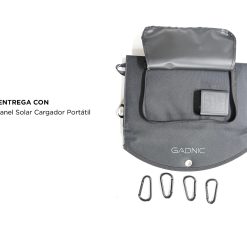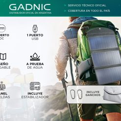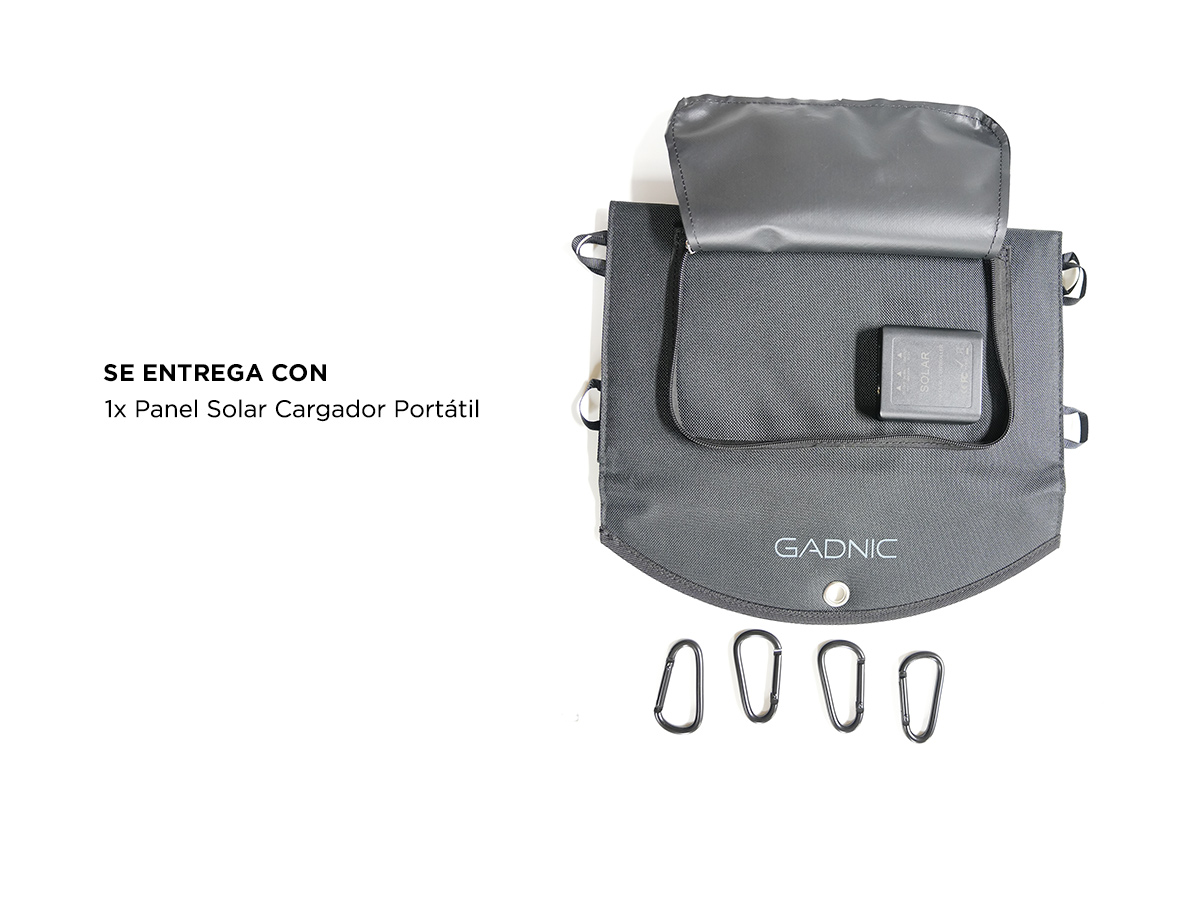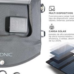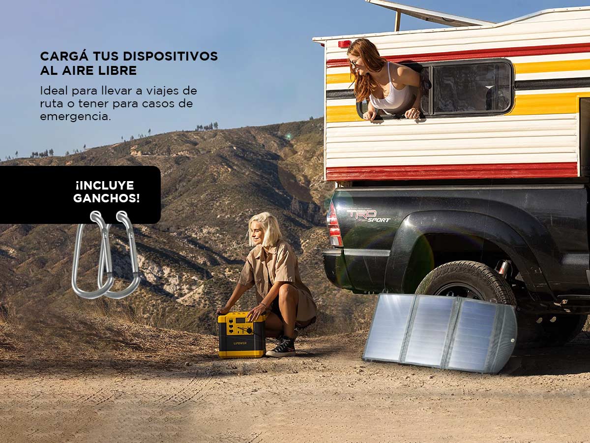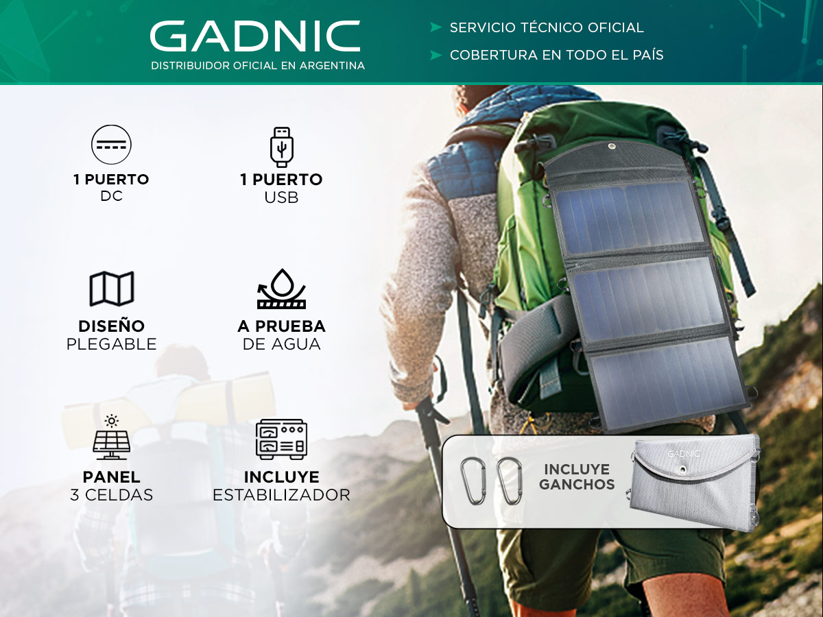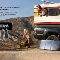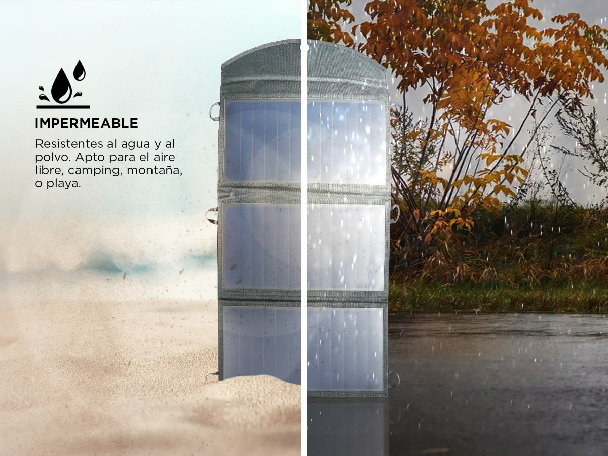Posee carga inteligente, es resistente al polvo y agua. Ideal para cargar dispositivos al aire libre, camping montaña, o playa.