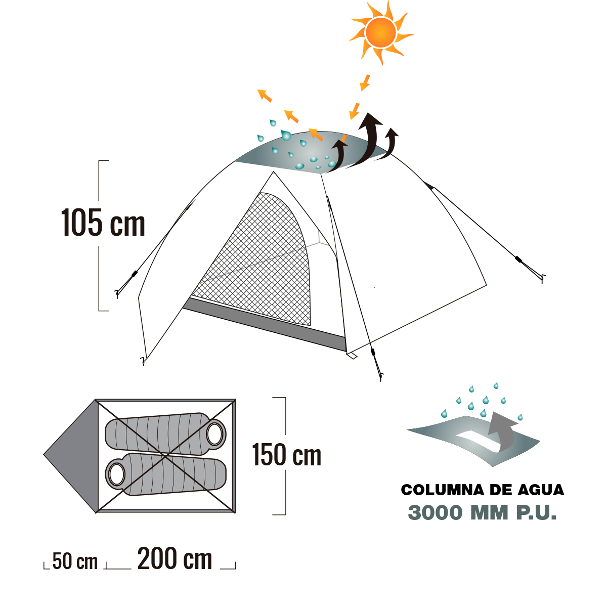 Carpa trekking Waterdog Terra Medida exterior: 200 x 200 x 105 cm Estructura: Fibra de vidrio 7,9 mm Peso: 2,86 kg Tejido exterior: Poliéster 190T aluminizado. Tejido interior: Poliéster 170T respirable. Piso: Polietileno 100% PE SHEET 12×10 120 g/m2 Columna de Agua: 3000 mm P.U. Mosquitero: Poly Mesh No See Um. Costuras reforzadas termoselladas. Cubretecho hasta el piso. 1 entrada y 1 ábside. Cierres reforzados.Bolso con correa de transporte. Tirantes para vientos. Estacas.