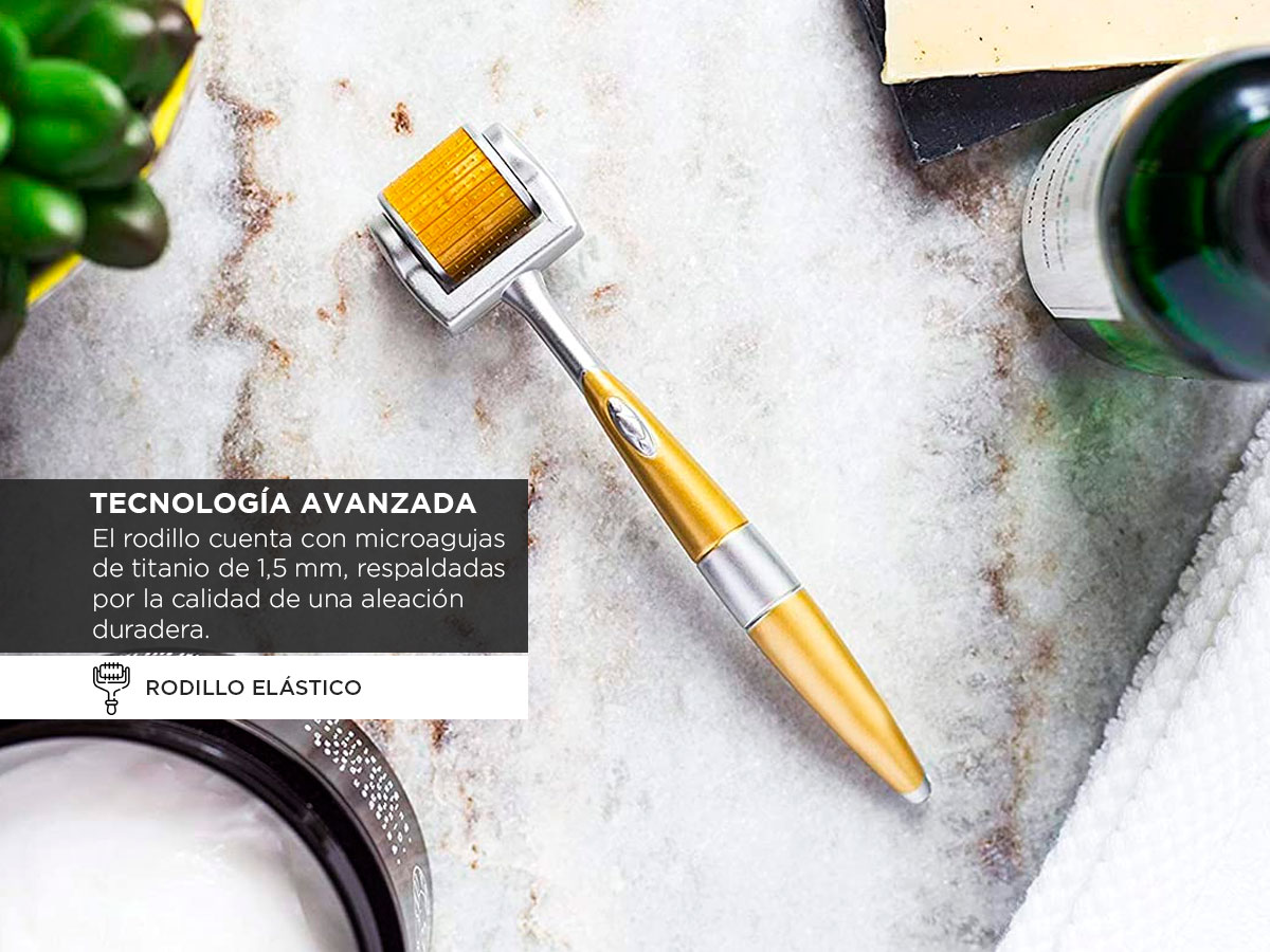 Tecnología Avanzada: Nuestro rodillo cuenta con microagujas de titanio de 1,5 mm, respaldadas por la calidad de una aleación duradera, para ofrecerte una experiencia de cuidado de la piel de vanguardia.