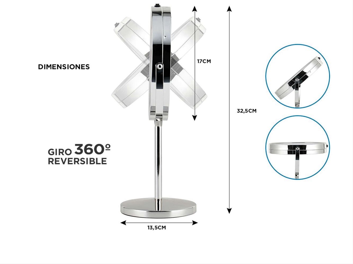 - Dimensiones: 17cm diámetro espejo – 32,5cm alto total con base – 13,5cm. diámetro base