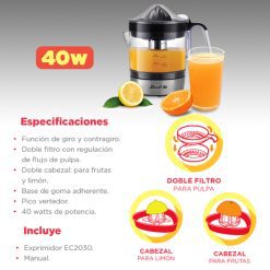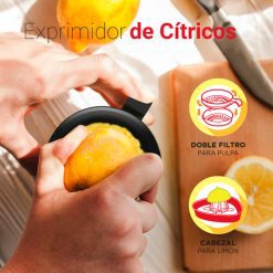 - Doble cabezal: Incluye cabezales específicos para frutas y limón, adaptándose a tus necesidades.