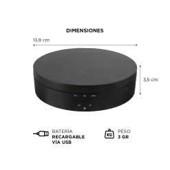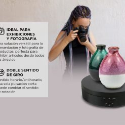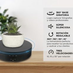 La Plataforma Eléctrica Giratoria 360° es una solución versátil para la presentación y fotografía de productos, perfecta para exhibir artículos desde todos los ángulos. Con tres opciones de velocidad (10, 15 y 30 segundos por rotación) y la capacidad de cambiar la dirección de giro, este dispositivo proporciona un control completo sobre la presentación de tu producto.