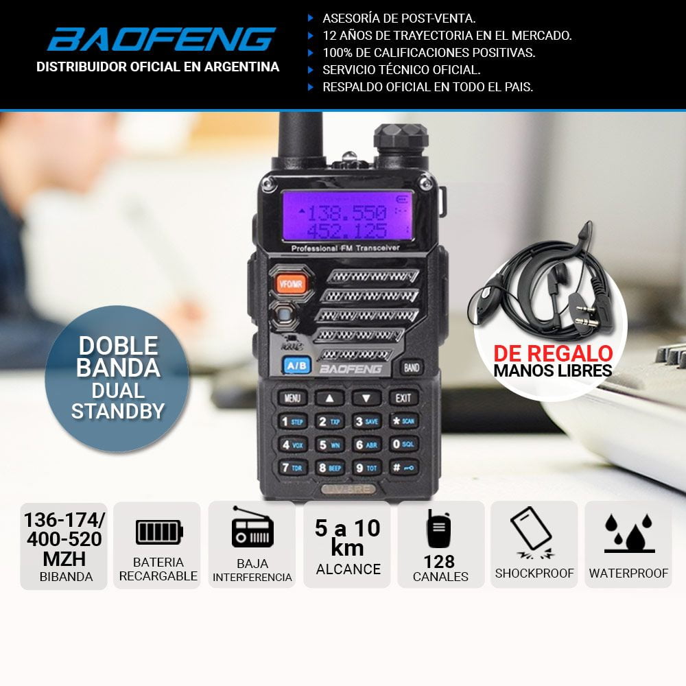 Handy Baofeng UV-5RE Bi-Banda 5w 128CH Hasta 10km 2 Baterías y Manos Libres