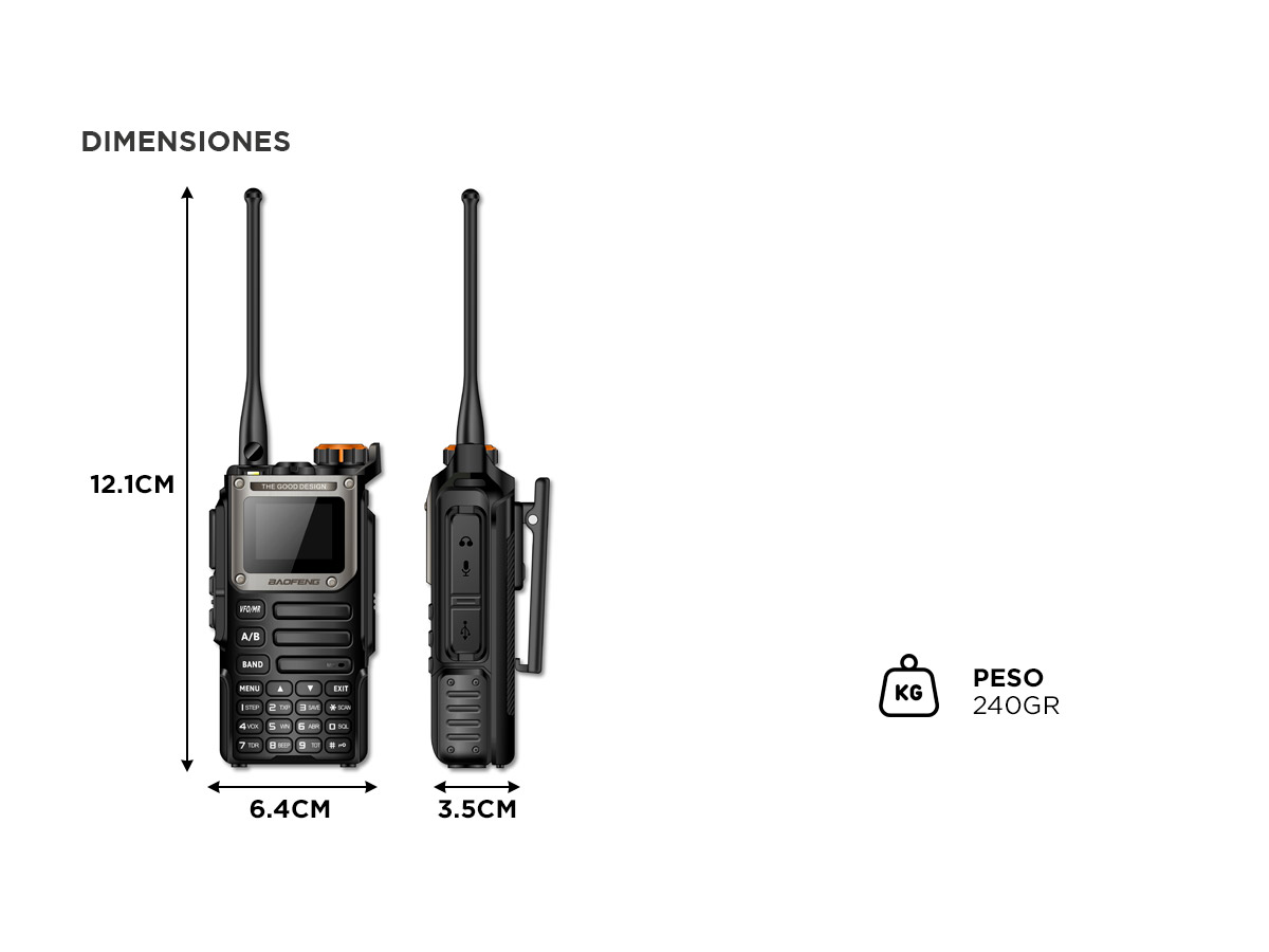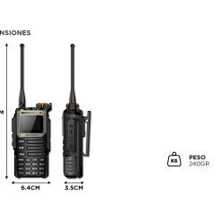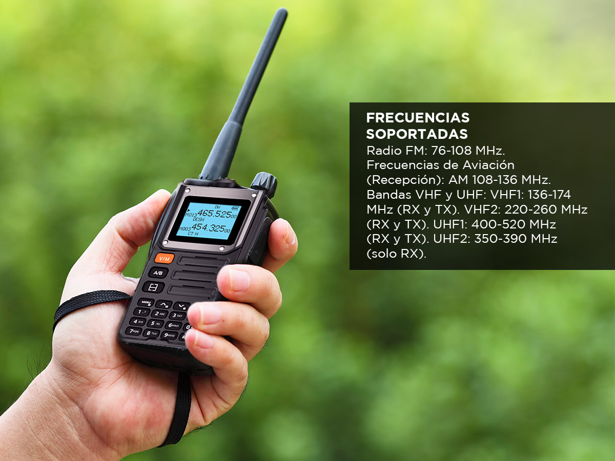 - VHF1: 136-174 MHz (RX y TX); VHF2: 220-260 MHz (RX y TX)