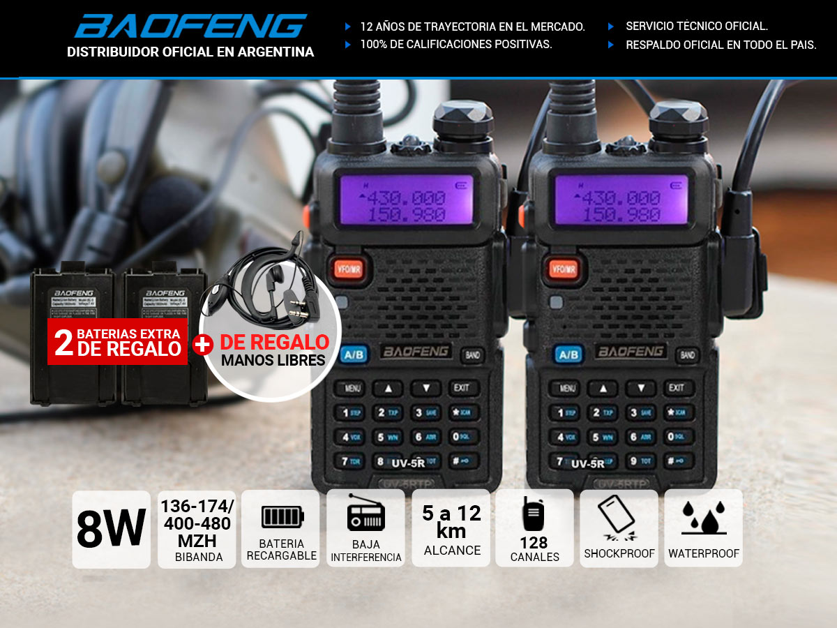 Acerca de Handy Baofeng UV-5R Kit x2 Bi-Banda 8w Hasta 12km + 4 Baterías y 2 Manos Libres