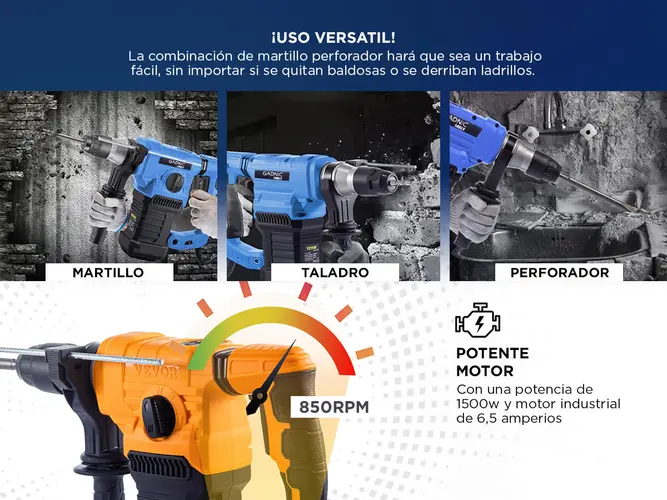 Potente Motor: Con una potencia de 1500w y motor industrial de 6,5 amperios con 5,5 libras de impacto está diseñado para completar proyectos de trabajo pesado de concreto y metal