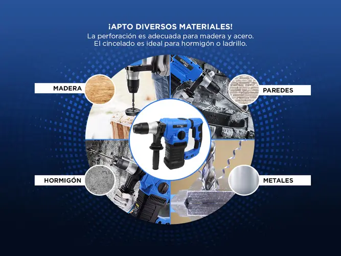 4 funciones diferentes del taladro percutor SDS, la perforación es adecuada para madera, acero, etc. El cincelado es ideal para hormigón o ladrillo. Además, la perforación con percusión es ideal para trabajos pesados y el ajuste de la posición del cincel se adapta a varios escenarios de trabajo