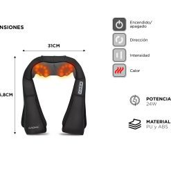 El masajeador cuenta con un sistema de masajes 4G y un mantón de amasado calentador con luz roja, que proporciona una experiencia de masaje cálida y reconfortante. Con una tensión nominal de 220V/DC12V y una potencia nominal de 24W a 50HZ, este masajeador es eficiente y potente.