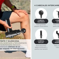 A pesar de su potente rendimiento, su funcionamiento es sorprendentemente silencioso, permitiéndote disfrutar de un masaje relajante sin interrupciones. Además, incluye cuatro cabezales de masaje intercambiables para abordar diferentes áreas y necesidades musculares.