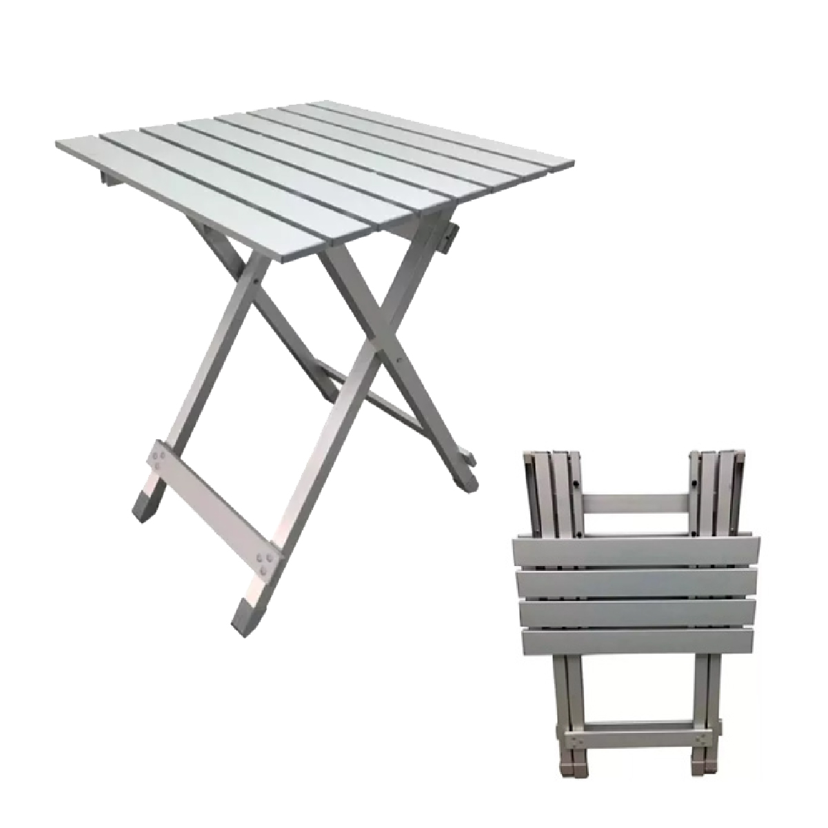 Mesa plegable de aluminio Waterdog TA564 Medida: 70 x 70 x 70 cm. Tubo de 20×20 mm Capacidad de resistencia 30 kg. Material: Estructura de acero Tablero superior de listones de aluminio. Fácil apertura. Plegable.