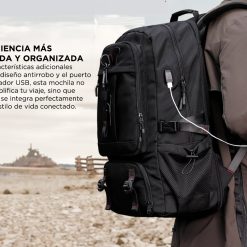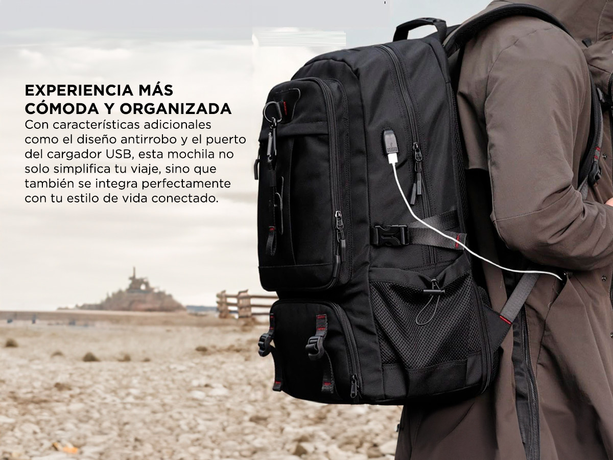 Con características adicionales como el diseño antirrobo y el puerto del cargador USB, esta mochila no solo simplifica tu viaje, sino que también se integra perfectamente con tu estilo de vida conectado.