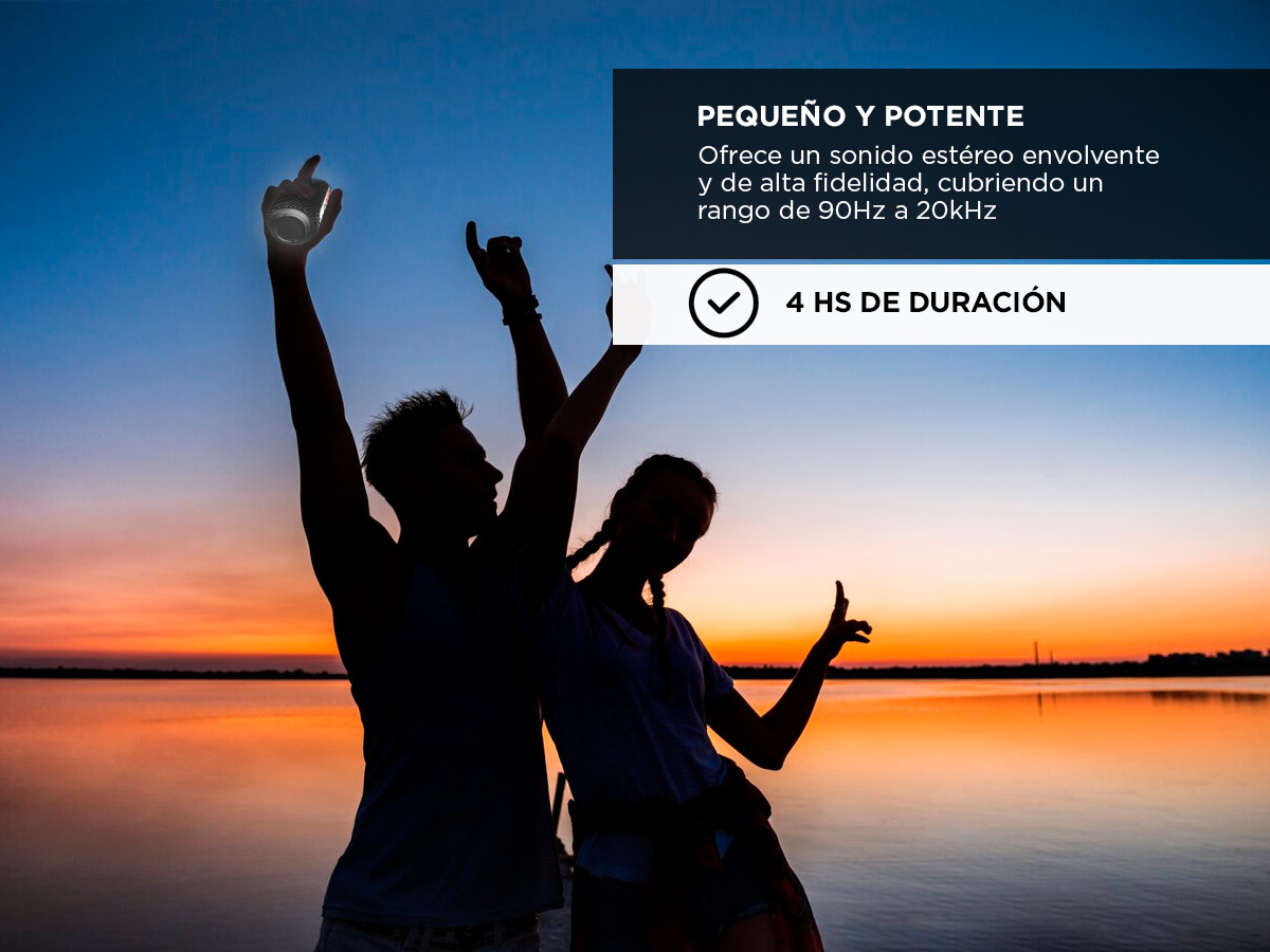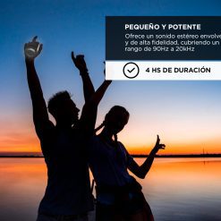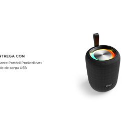 El Bluetooth PocketBeats cuenta con certificación IPX5, haciéndolo resistente al agua y perfecto para su uso en exteriores, en la playa o junto a la piscina. La batería de litio de 3.7V 2000mAh proporciona hasta 4 horas de reproducción continua al 70% del volumen, con un tiempo de carga rápida de solo 2.5 horas mediante el puerto USB.