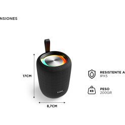 Con dimensiones compactas de 87 x 170 x 87 mm y un peso de solo 0.61 kg, este parlante es fácil de transportar. Incluye un cable de carga USB y un manual de usuario para una configuración rápida y sencilla. Los botones funcionales permiten cambiar de modo, ajustar el volumen y encender/apagar el dispositivo con facilidad.