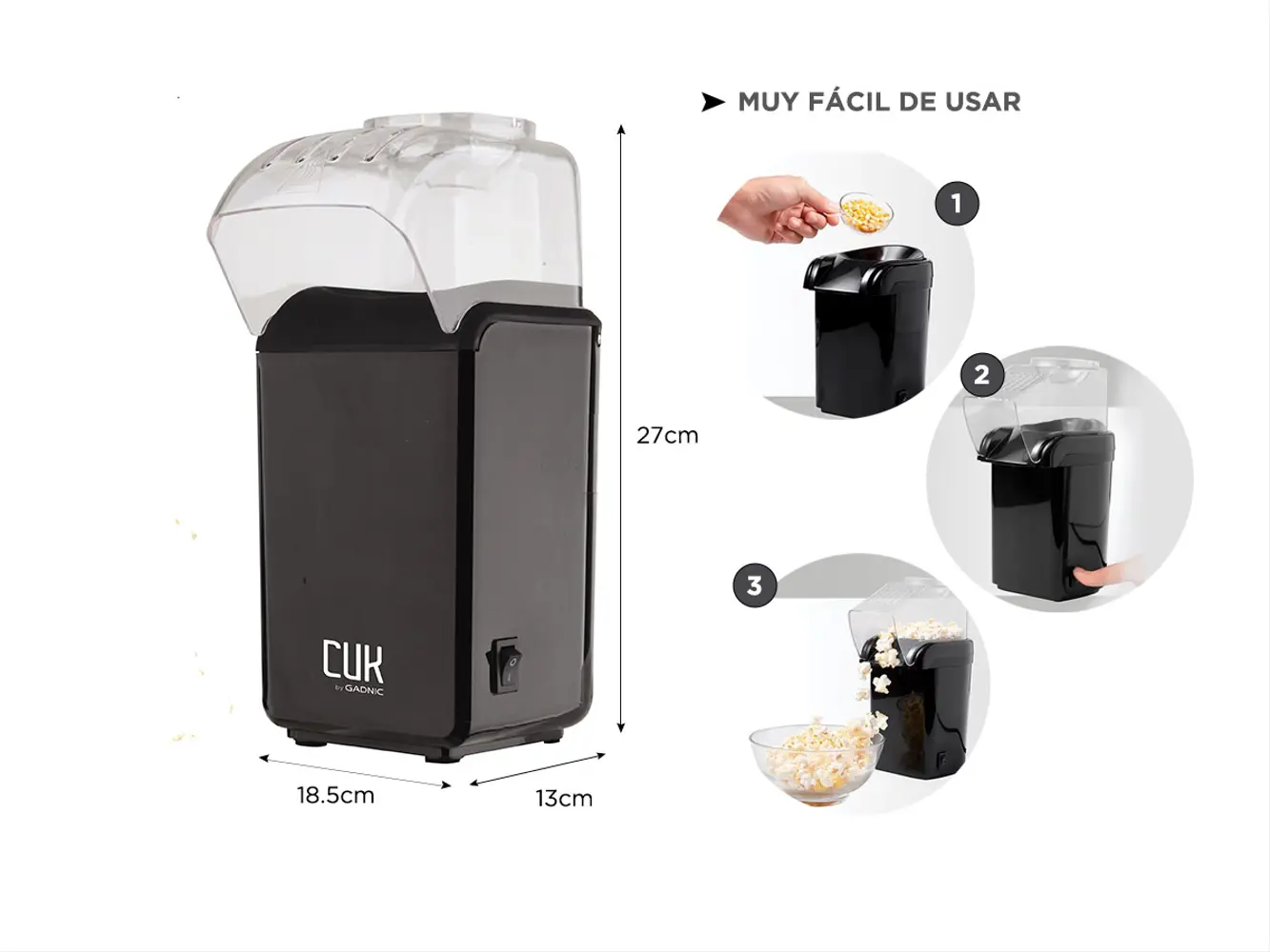 Fresco y saludable: no más grasas saturadas innecesarias, aire caliente, eso es todo lo que necesitas para hacer palomitas de maíz caseras. Diseño compacto: el diseño de esta máquina de palomitas es perfecto para cualquier cocina, dormitorio u oficina Es pequeño y portátil, por lo que puedes llevarlo contigo incluso cuando estás de viaje.