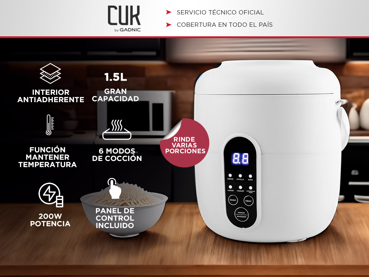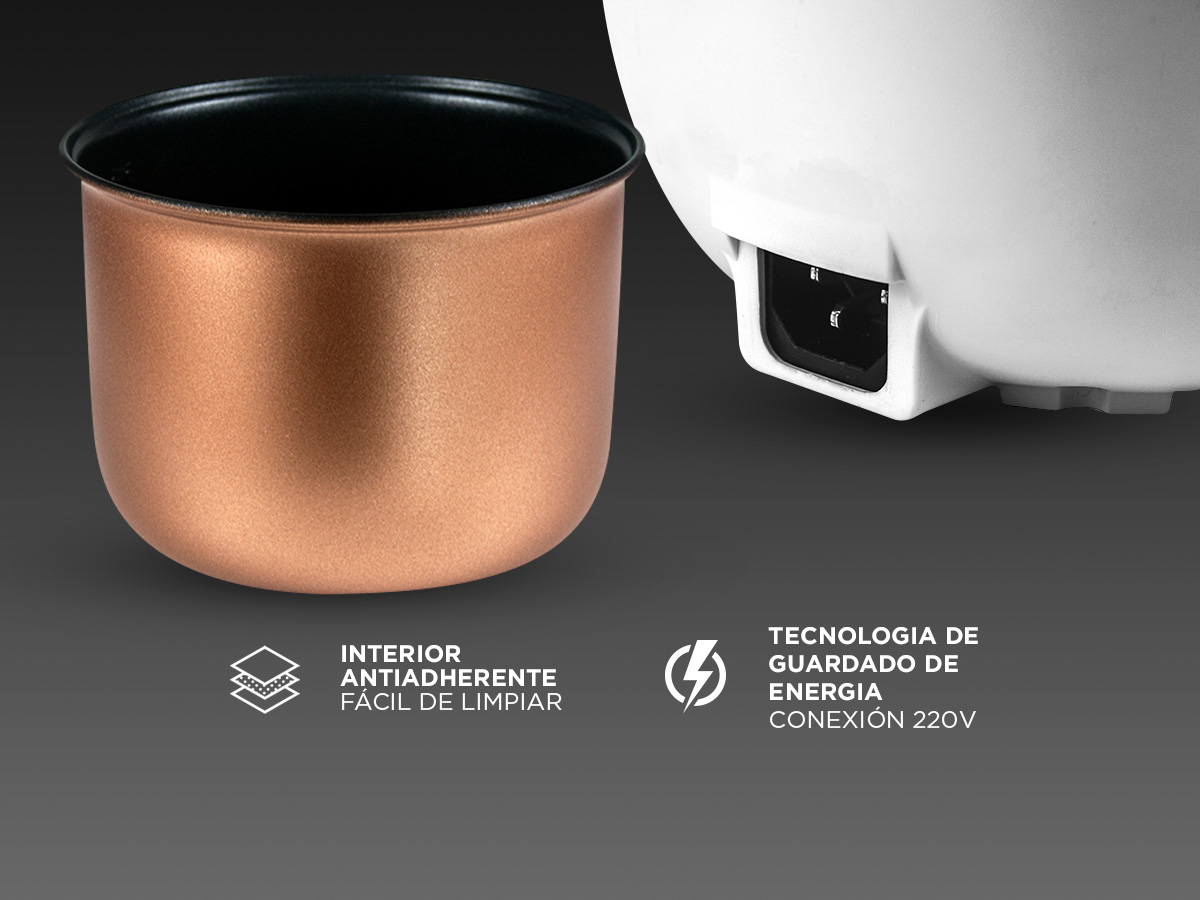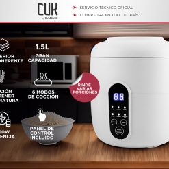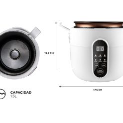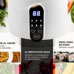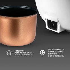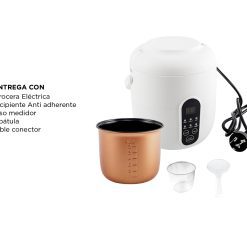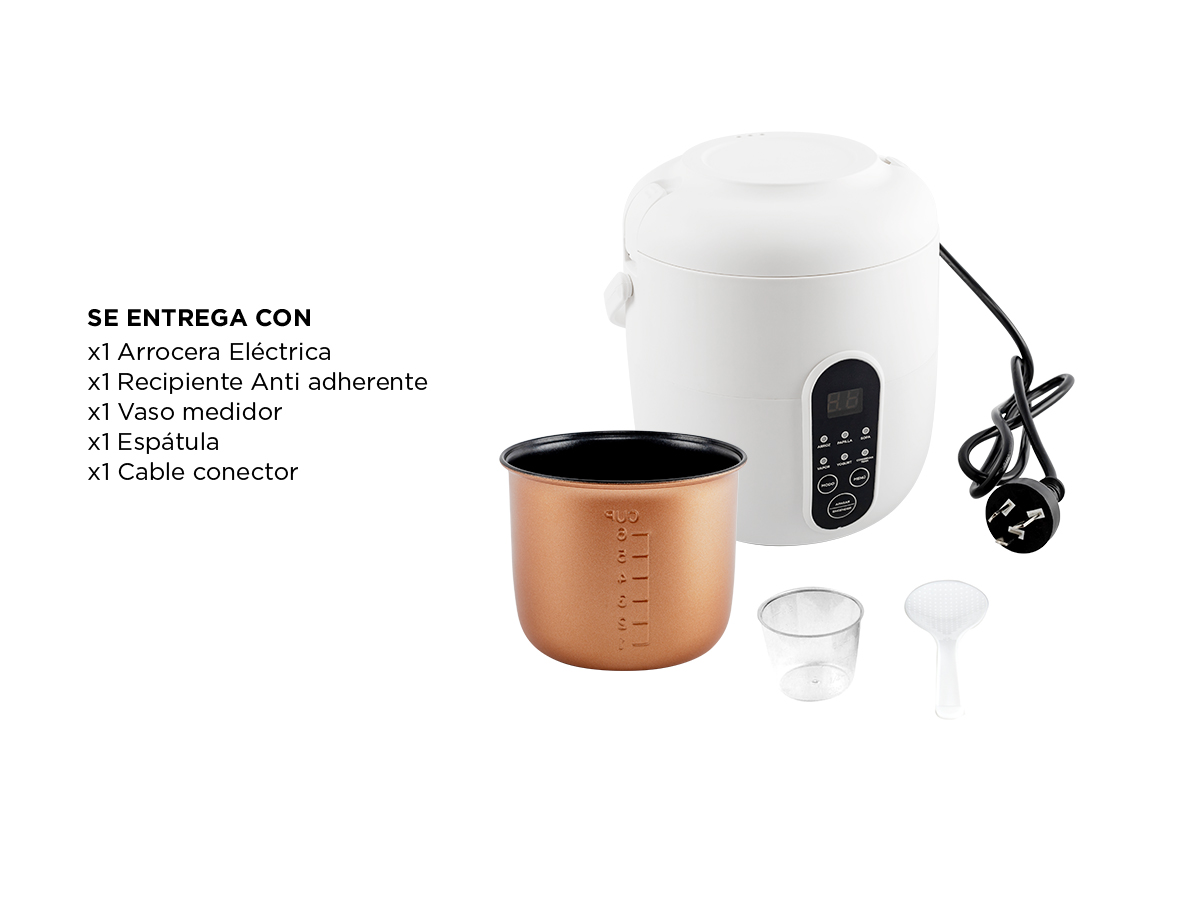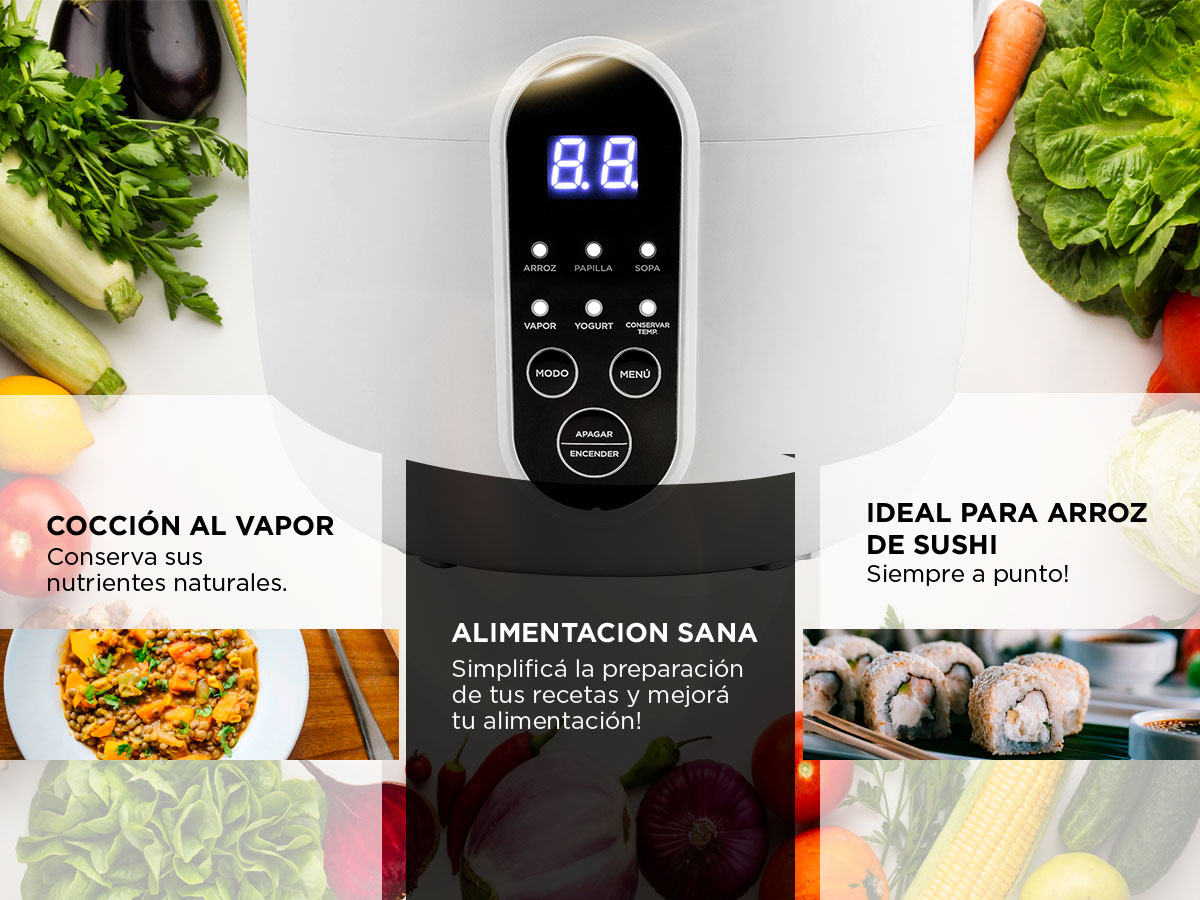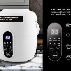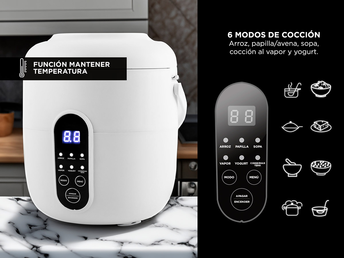 - Funciones: Arroz, avena, sopa, vapor, yogur, mantener caliente