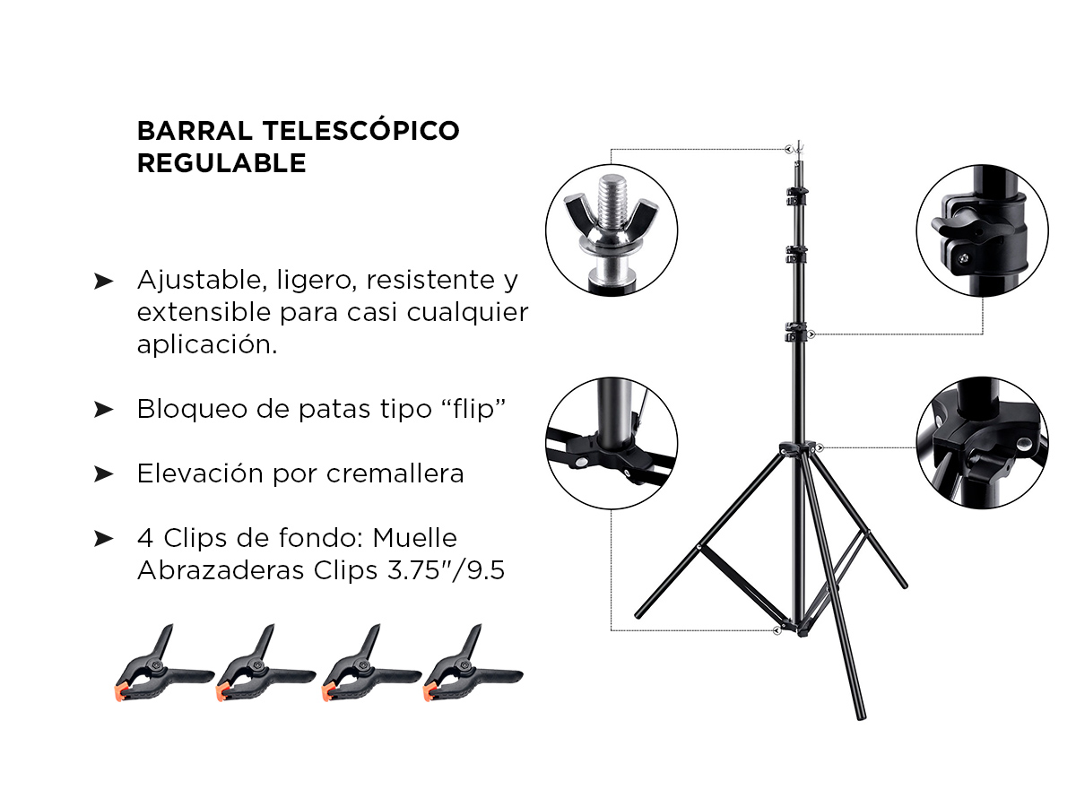 Incluye 4 clips de sujecion tipo abrazaderas para fondos fotograficos y una bolsa de transporte resistente que le proporciona la comodidad de llevar el kit a cualquier lugar que necesites.