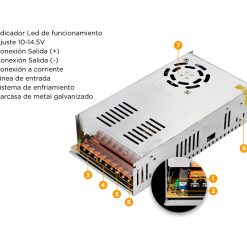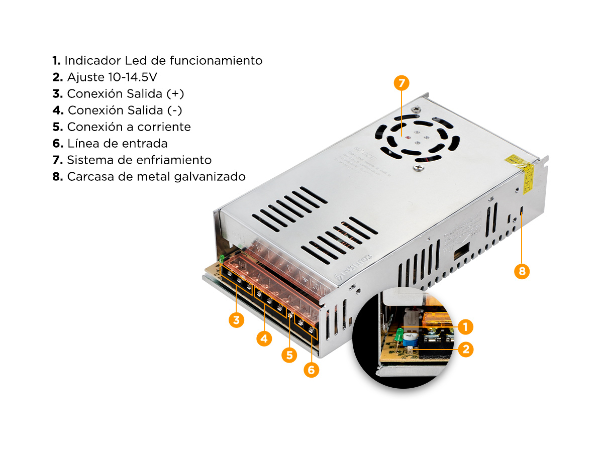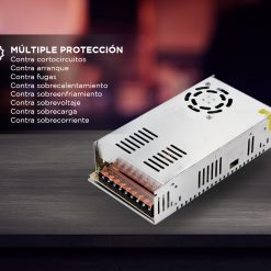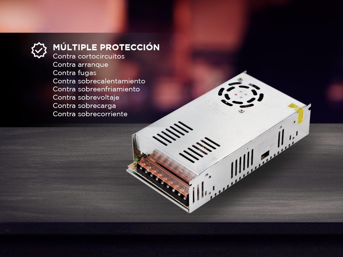 - Rango de Tensión: 90-132VAC / 180-264VAC (seleccionable) 254-370VDC